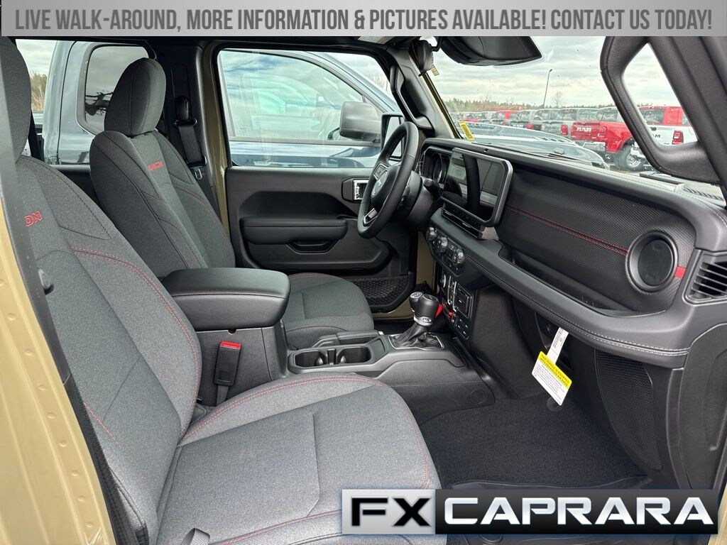 110 Mph Vehicle Max Speed Calibration, 12.3" Touchscreen Display, 4-Wheel Disc Brakes, 4.10 Rear Axle Ratio, 4G LTE Wi-Fi Hot Spot, 8 Speakers, ABS brakes, Air Conditioning, Alexa Built-in, Alloy wheels, AM/FM radio: SiriusXM with 360L, Apple CarPlay, Apple CarPlay/Android Auto, Automatic temperature control, Black 3-Piece Hard Top, Brake assist, Cloth Low-Back Bucket Seats, Compass, Connectivity - US/Canada, Convenience Group, Delay-off headlights, Driver door bin, Driver vanity mirror, Dual front impact airbags, Dual front side impact airbags, Electronic Stability Control, Emergency communication system: Jeep Connect, For Details, Visit DriveUconnect.com, Freedom Panel Storage Bag, Front anti-roll bar, Front Bucket Seats, Front Center Armrest w/Storage, Front dual zone A/C, Front fog lights, Front License Plate Bracket, Front reading lights, Fully automatic headlights, Google Android Auto, Heated door mirrors, Heated Front Seats, Heated Steering Wheel, Illuminated entry, Integrated Center Stack Radio, Integrated roll-over protection, Low tire pressure warning, Manufacturer's Statement of Origin, MOPAR All-Weather Slush Mats, MOPAR Soft Tri-Fold Tonneau Cover, MOPAR Spray in Bedliner, MyFlexCare Service Plan, Occupant sensing airbag, Outside temperature display, Overhead airbag, Panic alarm, Passenger door bin, Passenger vanity mirror, Performance Suspension, Power Dome Dual Vented Hood, Power door mirrors, Power steering, Power windows, Quick Order Package 24R Rubicon, Radio data system, Radio: Uconnect 5 with 12.3" Display, Rear anti-roll bar, Rear reading lights, Rear Sliding Window, Rear Window Defroster, Remote keyless entry, Remote Start System, Security system, SiriusXM Radio Service, SiriusXM with 360L, Speed control, Split folding rear seat, Star MOPAR Body Side Graphic, Steel Power Dome Hood Package, Steering wheel mounted audio controls, Tachometer, Telescoping steering wheel, Tilt steering wheel, Traction control, Trip computer, Universal Garage Door Opener, USB Host Flip, Variably intermittent wipers, Voltmeter, Wheels: 17" x 7.5" Machined/Painted Black.