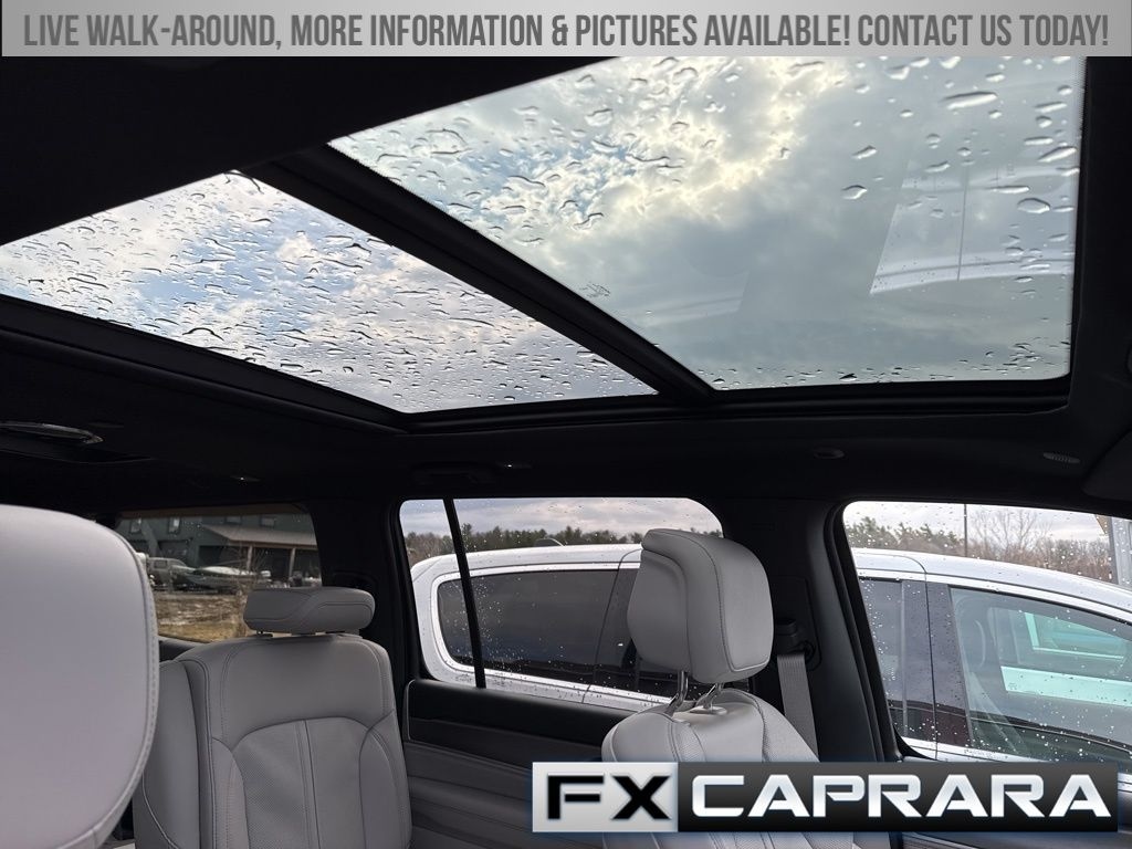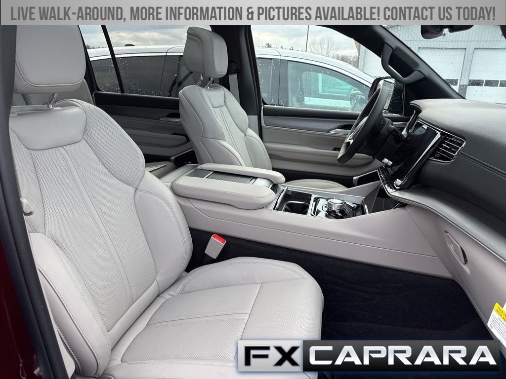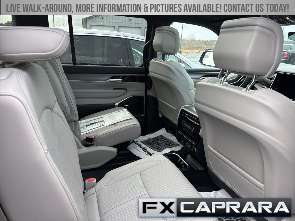 118 MPH Maximum Speed Calibration, 3 Panel Sunroof, 3.55 Rear Axle Ratio, 3rd row seats: bench, 4-Wheel Disc Brakes, 9 Speakers, ABS brakes, Air Conditioning, Alloy wheels, AM/FM radio: SiriusXM with 360L, Anti-whiplash front head restraints, Apple CarPlay/Android Auto, Audio memory, Auto Adjust in Reverse Exterior Mirrors, Auto High-beam Headlights, Auto Power-Folding Mirrors, Auto-dimming door mirrors, Auto-Dimming Exterior Driver Mirror, Auto-dimming Rear-View mirror, Auto-leveling suspension, Auto-Power-Folding Exterior Mirrors, Automatic temperature control, Black Exterior Accents, Brake assist, Bumpers: body-color, Compass, Delay-off headlights, Driver door bin, Driver vanity mirror, Driver's Seat Mounted Armrest, Dual front impact airbags, Dual front side impact airbags, Electronic Stability Control, Emergency communication system: Jeep Connect, Exterior Mirrors Approach Lamps, Exterior Mirrors with Memory, Exterior Mirrors with Supplemental Signals, Exterior Parking Camera Rear, Four wheel independent suspension, Front anti-roll bar, Front Bucket Seats, Front Center Armrest w/Storage, Front dual zone A/C, Front fog lights, Front reading lights, Fully automatic headlights, Garage door transmitter, Heated door mirrors, Heated Exterior Mirrors, Heated front seats, Heated steering wheel, Illuminated entry, Interior Rear Facing Camera, Knee airbag, Low tire pressure warning, Luxury Front and Rear Floor Mats, Manufacturer Statement of Origin, Memory seat, MyFlexCare Service Plan, Navigation System, Normal Duty Suspension, Occupant sensing airbag, Outside temperature display, Overhead airbag, Overhead console, P and P Park and Unpark Assist with Stop System, Panic alarm, Passenger door bin, Passenger seat mounted armrest, Passenger vanity mirror, Power door mirrors, Power driver seat, Power Liftgate, Power passenger seat, Power steering, Power windows, Premium Group I, Quick Order Package 29E Grand Wagoneer, Radio data system, Radio: Uconnect 5 Nav with 12" Display, Rain sensing wipers, Rear air conditioning, Rear anti-roll bar, Rear reading lights, Rear seat center armrest, Rear window defroster, Rear window wiper, Reclining 3rd row seat, Remote keyless entry, Reversible Carpet/Vinyl Cargo Mat, Security system, Side Distance Warning, Speed control, Speed-sensing steering, Speed-Sensitive Wipers, Split folding rear seat, Steering wheel memory, Steering wheel mounted audio controls, Surround View Camera System, Tachometer, Telescoping steering wheel, Tilt steering wheel, Traction control, Trip computer, Turn signal indicator mirrors, Variably intermittent wipers, Ventilated front seats, Voltmeter, Wheels: 20" x 9.0" Machine Face Painted Aluminum.